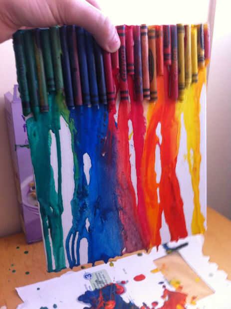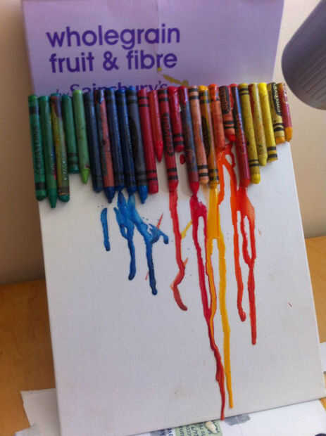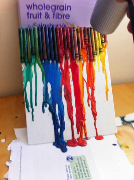Probar y aplicar el calor uniformemente a través de los lápices de colores, encontré algunos derretido más rápido que otros así que tuvimos que elegir concentrarse en las zonas. Deje que la cera por el lienzo, puede utilizar el secador para dirigir el flujo de la cera un poco si quiere/necesita.