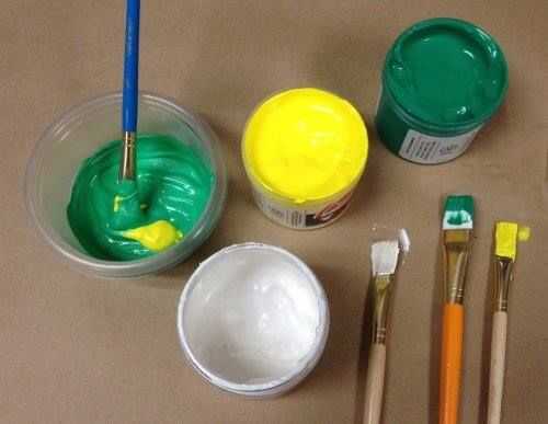 He utilizado tres colores diferentes y mezclado para hacer un bonito safari verde. Blanco nacarado opaco de speedball, amarillo y verde.