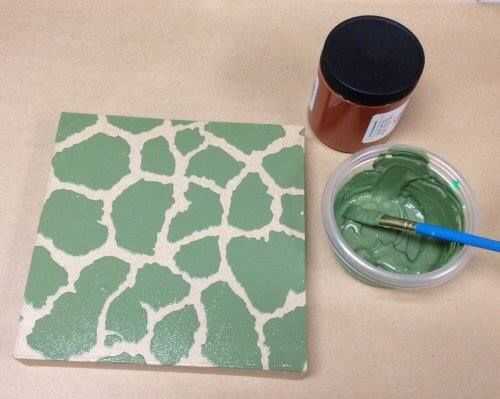 Usando la tinta verde safari, pantalla imprimir el diseño en la parte superior de la caja. Puede utilizar cinta de pintor azul para mantener la plantilla en su lugar o sosténgalo firmemente con la otra mano.