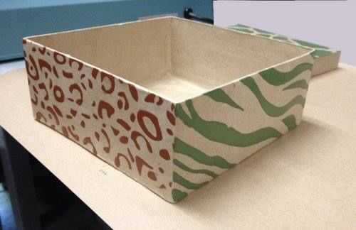 Repetir el mismo proceso en los lados de la caja utilizando la misma plantilla o una plantillas diferentes con otros diseños. He elegí una cebra y leopardo de impresión. El leopardo de impresión era pantalla impresa con Speedball marrón.
