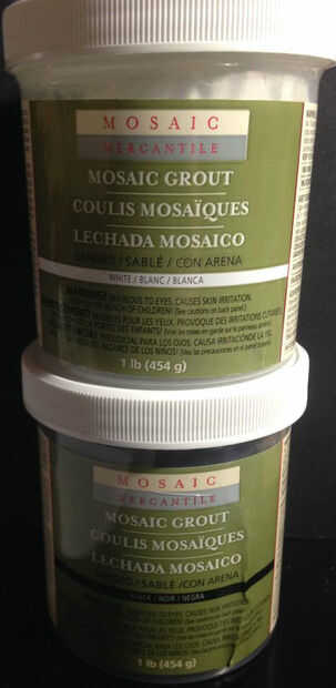 Las lechadas que actualmente estoy usando son de mosaico mercantil y una lechada con arena (significa que no están pre-mixed). Pre-mixed grout también está disponible en Michaels/A.C. Moore y probablemente son más fácil de trabajar con, pero también son dos veces el precio. Esta es la primera vez que estoy utilizando la lechada con arena negra y me pareció un poco más difícil trabajar con que los colores más ligeros.