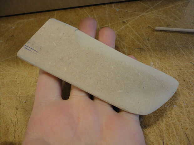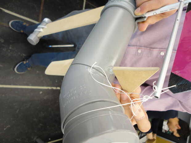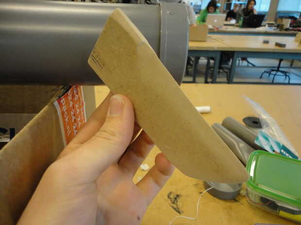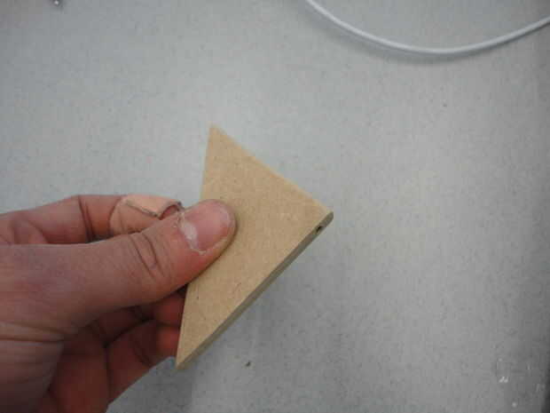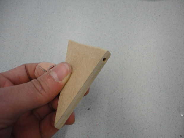 El timón se hace de madera del MDF, pulir los bordes, perforar un agujero de arriba para pegar una varilla de madera en lo que se adapta el anterior tubo de aluminio.