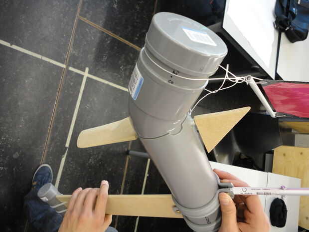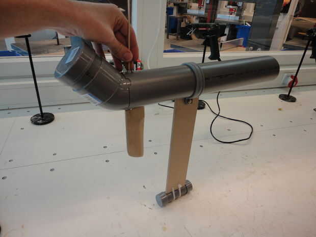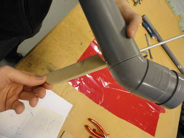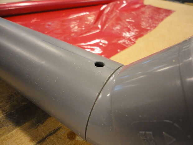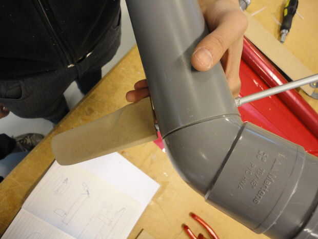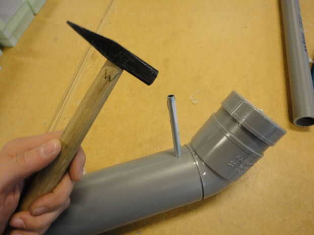 Corta un trozo de tubo de aluminio hueco, arena los bordes. Marca el casco de PVC donde quiere el timón para ir. Taladro en el casco con una broca un poco más pequeña y fuerza encajar el tubo de aluminio con un martillo. Use pegamento de PVC a totalmente a prueba de agua el casco.