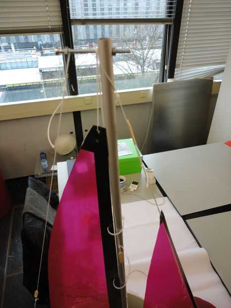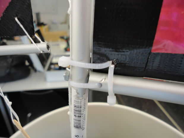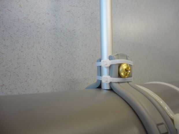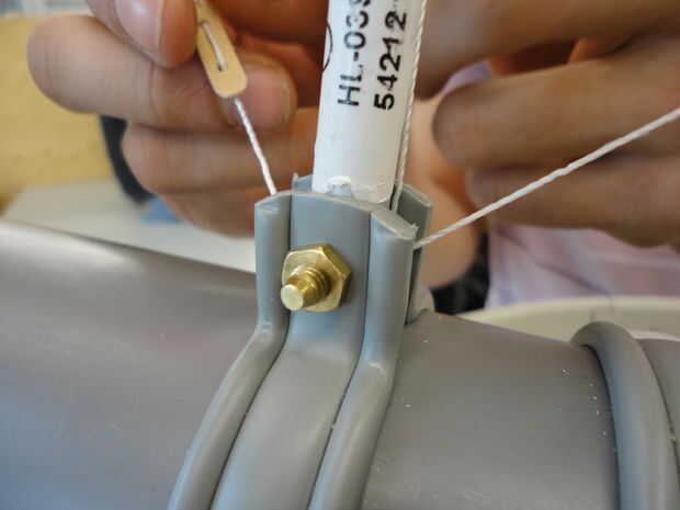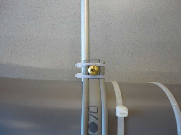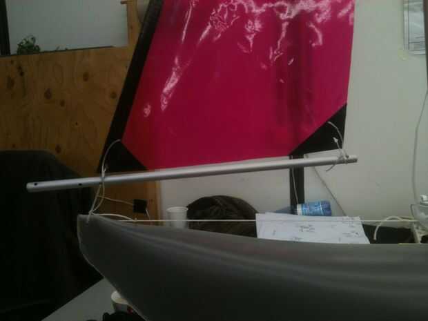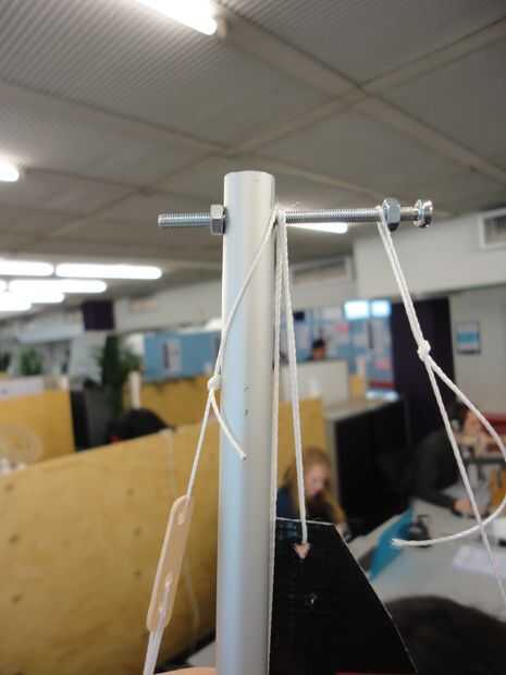Utilice la abrazadera de PVC para sujetar el mástil al casco (ver fotos). Perfore agujeros en la parte superior del mástil y aprox. 40 mm por encima del casco. Use la cuerda para sujetar el mástil a la proa y la popa.