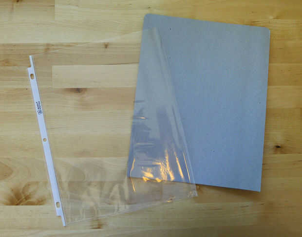 Tomar un pedazo de cartulina gruesa o cartón delgado y cortar para caber cómodamente dentro de su protector de página.