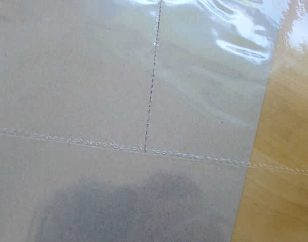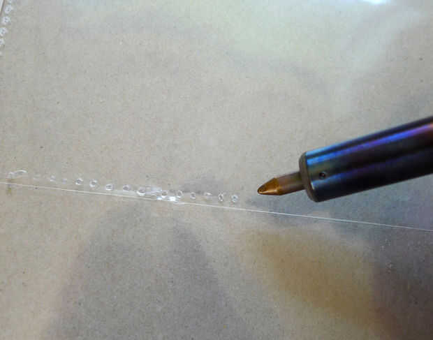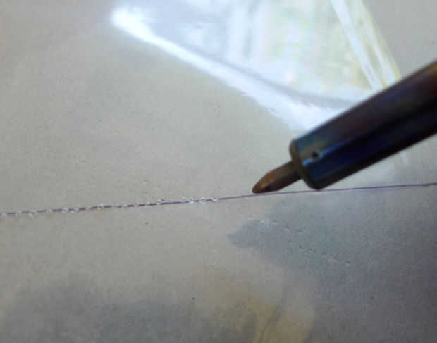 Para las líneas horizontales, utilizar la pluma de leña para hacer una línea punteada sobre el corte en la página de protector.