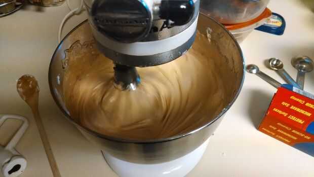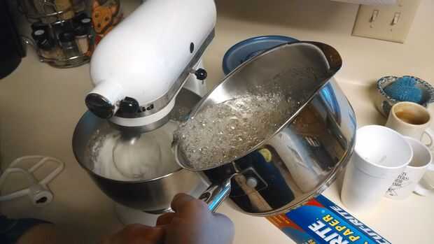 ADVERTENCIA: La mezcla es extremadamente caliente. No tiene la batidora en una velocidad o puede salpicar hacia arriba en usted. Tenga mucho cuidado al verter el jarabe de azúcar en cualquier momento!!!!