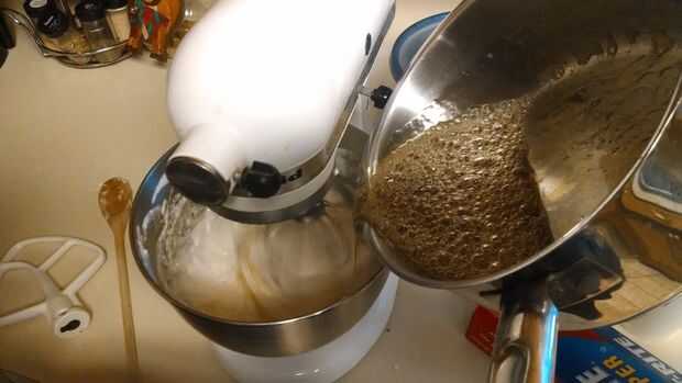 Una vez más, lentamente Vierta la mezcla en la mezcla de huevo/azúcar jarabe mientras la batidora a baja velocidad.