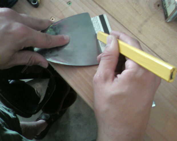 Medir la tarjeta y marque una línea en el centro exacto. El mío mide 2 1/8", así que los corte en secciones de 1 1/6". Utilice un borde recto para marcar y cortar las líneas para que sean limpias. Si tus bandejas de cajón son más profundos que 1", medir la profundidad y corte la tarjeta por consiguiente.