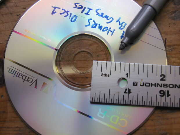 Ahora un error se arrastró, en mi medida. Medí una media pulgada desde el borde del agujero en el centro del CD. Debo han medido un cuarto de pulgada por lo que terminaría con un total de una media pulgada de material a quitar. La consecuencia es que tengo un agujero mucho más grande de necesario. (Lamentablemente no noté que nada fue mal hasta que estaba poniendo en la barra).