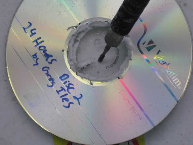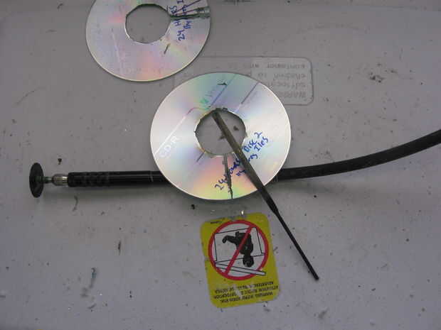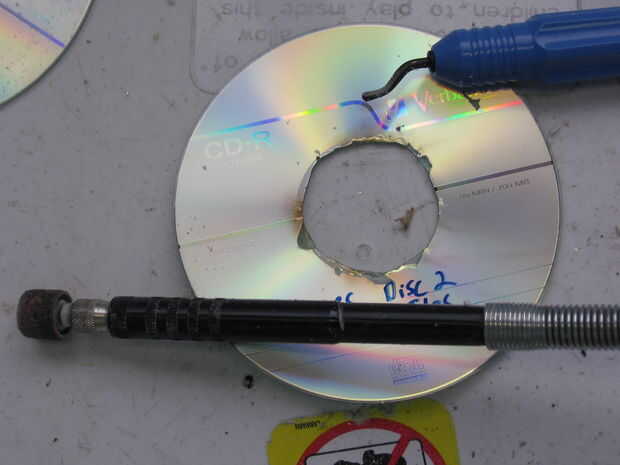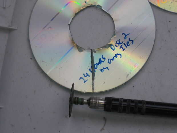 Con agujero alisado usé un disco de corte para cortar desde el borde del nuevo agujero en el borde del CD. Este corte permite que el CD que se colocará sobre la barra del armario por doblar los bordes del corte en direcciones opuestas. Luego limpiar el corte con una Lima.