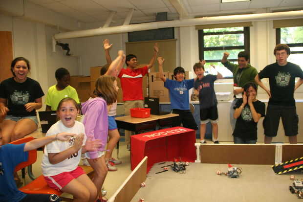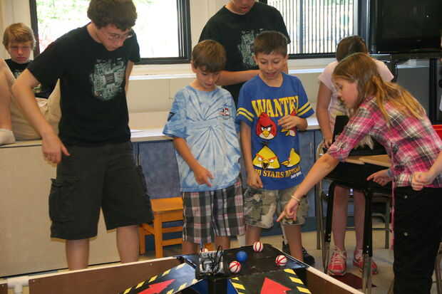 Una vez que sus robots fueron acabados, los niños estaban ansiosos por unidad. Teníamos rotar en turnos de dos minutos para que todo el mundo era capaz de conducir varias veces. Dominar los controles simples rápidamente y pronto estaban usando el campo exactamente como nosotros habíamos pensado: trabajaron en equipos para obtener cada uno otro arriba y abajo de los puentes desequilibrados o bolas directos desde el lanzador de la bola en sus objetivos. Consiguió realmente entusiasmados con el juego y parece tener un montón de diversión. Unos días después de la divulgación, que estableció el campo de la high School secundaria y había jugado como un equipo de robótica. Nos divertimos casi tanto como lo habían hecho.