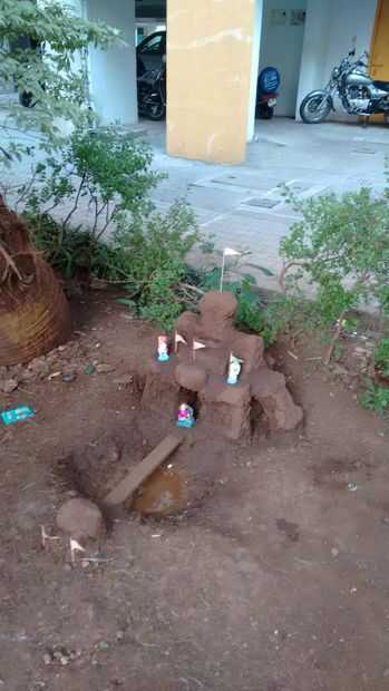 -Antes de añadir la siguiente capa de piedras puso una capa de barro para sujetar las piedras en su lugar