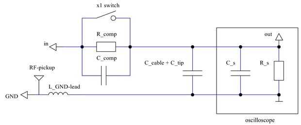 Una punta de prueba pasiva, como se muestra en el diagrama, utiliza una variable RC-elemento (etiquetado como "comp") en su camino de entrada para compensar la función de transferencia (S21 *) para aplicaciones baja frecuencia.