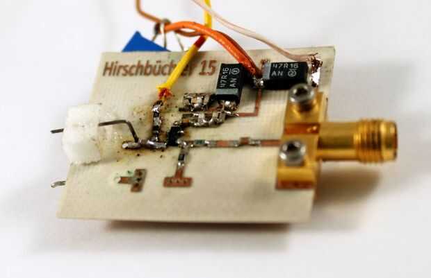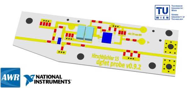 Tenga en cuenta que el camino de la RF se implementa como un 50Ohms línea (impedancia de la onda, no resistencia!) y se mantuvo separado de otros restos para ancho de una traza o tres veces el espesor del sustrato, lo que resulta en la separación más alta. El camino de entrada lo más corto posible, se quita el plano de tierra debajo de él y el FET para deshacerse de las capacidades parásitas. Nota que este primer tramo hasta el FET no es impedancia controlada, queremos ser como alta impedancia posible para no perturbar el circuito que estamos sondeando.