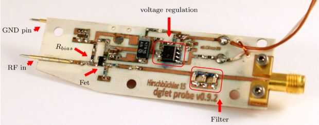 Para suministrar la energía, el Fetprobe puede utilizar todo, desde 12 a 30 voltios (es decir, puede manejar su regulador de voltaje). Tenga en cuenta que la implementación de hardware también cuenta con unos condensadores de bypass extra (sesgo, fuente del fet) y algunos cero ohmios-enlaces, donde podrían ir los diodos de protección, dependiendo del cuidado de cómo está la polaridad cuando usted montan. Cuando elegir gorras para la fuente Asegúrese de siempre se unen diversas clases en paralelo. E.q. 2.3µF electrolítico y cerámico de 100nF. Esto ayuda a superar el rendimiento de RF potencialmente pobre de los casquillos electrolíticos.