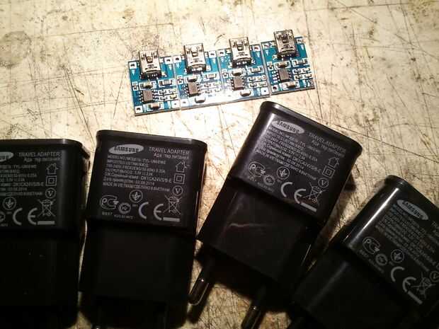 Para cargarlos hice 4 cargador de equilibrio de la célula de 4 usb cargador y 4 tarjetas carga usb TP4056 de litio.