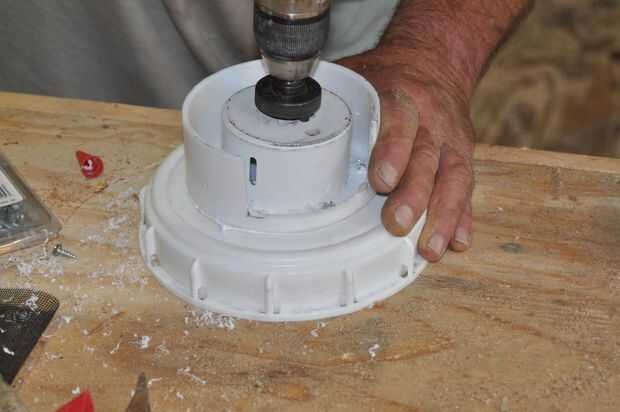 Entonces hemos perforado a través del casquillo de la pipa y cubierta con un serrucho 3". Mantiene un borde de media pulgada alrededor del interior de la tapa del tubo para los tornillos de que ambas partes juntas y como un lugar de descanso para nuestro "filtro grueso".