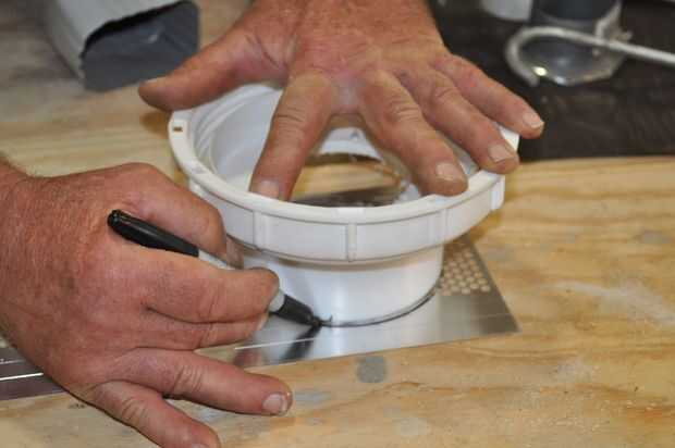 En primer lugar, nos muescas hacia afuera del borde de 4" lo suficientemente amplia como para una Encuadernación Pitorrobajo usando una sierra de Calar del casquillo de la pipa del PVC.