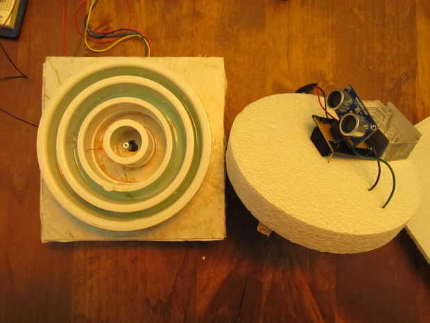 En el paso 9, hicimos el cable de señal y el cable de tierra que sale del circuito del sensor PING largo. Guía de los cables a través de la espuma de poliestireno en sus compartimientos respectivos por lo que los extremos expuestos en la solución de vinagre y sal. La integridad de esta conexión debe mantenerse a lo largo de la rotación de la plataforma, para que alambre suficientemente que hacer es tocar la solución.