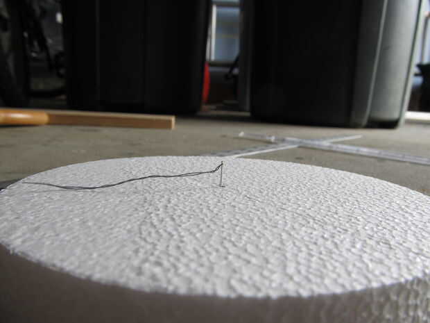 Nota: Usted puede ajustar la madera de balsa o poner algo plano y pesado en la parte superior para evitar que el pegamento gorila ampliando de tal manera que la madera de balsa no está nivelada. También, ya que poniendo el enganche en el centro de esto más adelante, procure no utilizar demasiado pegamento del gorila o el riesgo de llenar el pedazo de centro cuando se expande. ADVERTENCIA: Hay una buena cantidad de fuertes adhesivos que se alimentan a través de la espuma de poliestireno (piensa napalm-como la reacción). Primero trataron de adherencia con el goop hogar y, sobra decirlo, teníamos que ir a comprar un nuevo 6" pieza de espuma de poliestireno.