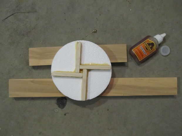 Encontrar el centro de la espuma de poliestireno con una regla y haga un orificio a través del centro con un alfiler. Este pin actuará como una guía para centrar el acoplador. En nuestro escenario, cavamos a través de nuestras plumas buscando un cuerpo de pluma que algo bien del motor paso a paso. Una vez que el acoplador se centra en la espuma de poliestireno, garantizar 4 6" piezas 3/8" x 3/8" de madera de balsa en el enganche con pegamento del gorila. No pegue el acoplador en el centro todavía. En la imagen se muestra el diseño en madera de balsa.