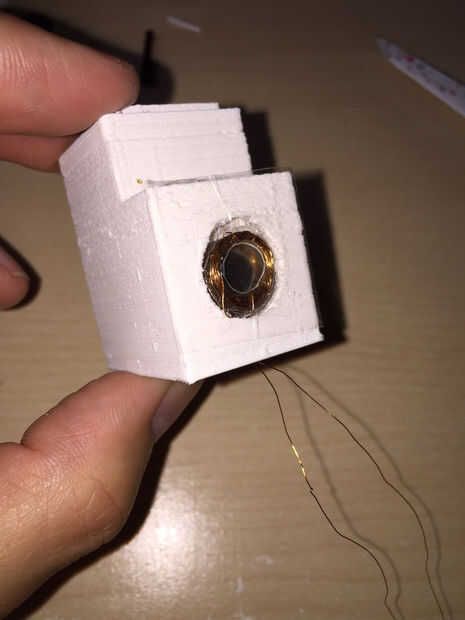 Por otra parte, hacer lo que hice. Usar alguna cinta y cinta adhesiva en un lado de la membrana. En el otro lado pega la bobina de la cinta en el agujero. Luego con cinta en ese lado, atrapando la bobina en el medio. No olvide dejar los cables de cobre que sobresalga de la parte inferior de la membrana.