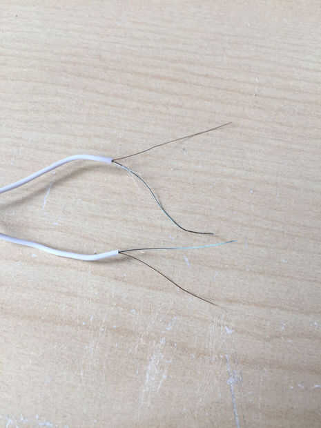 Debe tener algo como la imagen de arriba. 2 cuerdas plásticas, cada una con 2 cables. Aquí puede ver los cables azul y rojo enamalled. Utilizando el papel de la arena como lo hiciste anteriormente. Lije ligeramente el esmalte para pelado el cable de cobre por debajo.