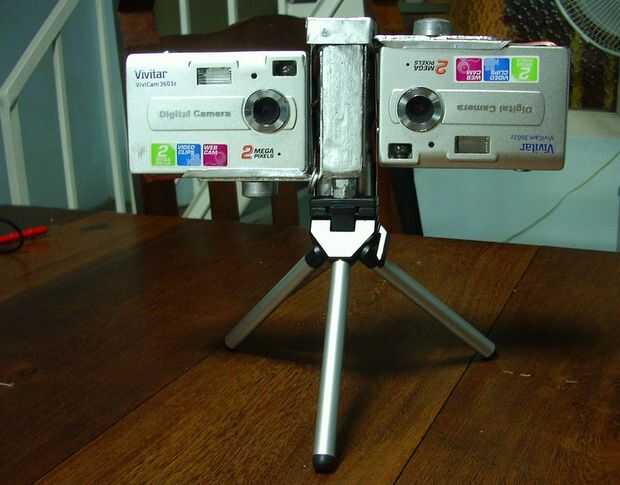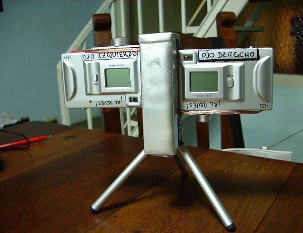 Finalmente me decidí a hacer un estéreo matriz de cámaras. Como nunca me sobre el dinero (Afortunadamente), podría no permitirse comprar dos cámaras caras, así que elegí dos de Vivitar Vivicam 3603z, 2 MP, foco fijada, sin pantalla, vídeo habilitado sin sonido. Pagué algo así como U$ S 30 cada uno. Al principio puso de lado a lado, pero como el ancho de las cámaras es de 9,2 cm, tiros cerca produjeron muchos "fantasmas" y eran desagradables. Así que he decidido, aprovechando que las lentes de cámara son bastante cerca de un borde, uno de ellos invertir para que la distancia entre lentes es de aproximadamente 6,5 cm, que es la distancia estándar entre los ojos. Este tipo de acuerdo se llama "Z", soporte de la manera que parece un poco a la Z. Este arreglo fue mucho mejor, y se apresuraron a tomar fotos como un loco, con resultados muy buenos para mí. El momento de los disparos fue puramente mecánico, utilizando una Z en forma de palanca, que casi siempre condujo a diferencias en el número de milisegundos entre cada foto. Más adelante soldar un alambre fino a los microinterruptores de los disparadores de dos levas, que mejoró grandemente la situación, aunque no para resolver 100%