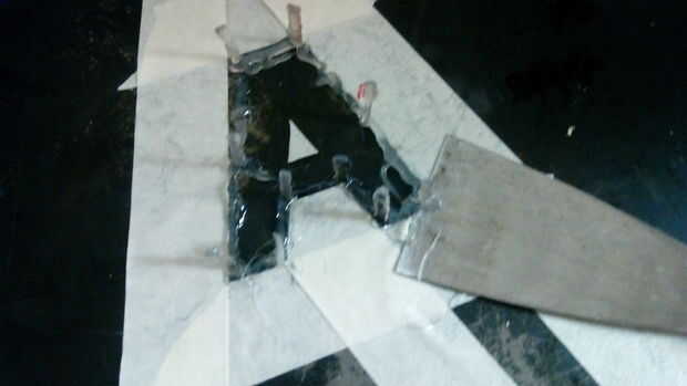 1 error en mis procesos, ya que entonces el estrecho de pegamento caliente en la placa, el resultado de esto fue que tuve algunos paces feos de pintura negra en el modelo 3d, la forma de simlest de resolver esto es con cinta adhesiva de la placa de orificio. Esto le permite esbozar su diseño en la cinta.
