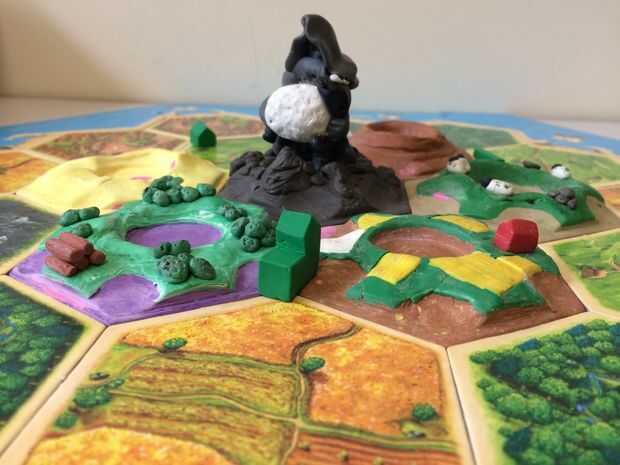 - (1 desierto Hex, 1 bosque de madera hexagonal, 1 Hex de ladrillo de la arcilla, 1 montaña Mineral hexagonal, hexagonal de pasto/ovejas, hexagonal de campos de trigo, 8 ciudades, 10 asentamientos y 16 caminos y por supuesto un ladrón que está robando las ovejas).