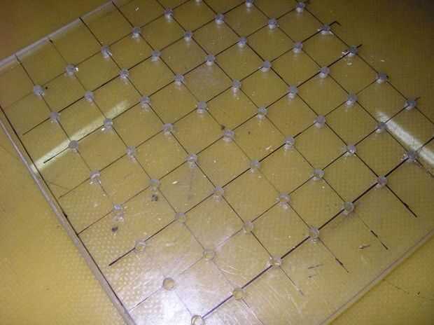Para su comodidad, para soldar LEDs hice una plantilla de plexiglás. Dibujar la rejilla 8 x 8 mm con un intervalo de diodos de 15 y perforado de los agujeros.