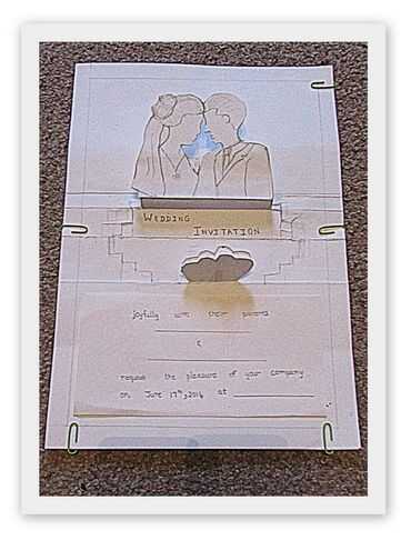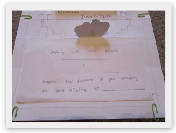 Esta es la parte principal de nuestra tarjeta donde Cordialmente invitamos a amigos y familiares para la celebración, especificando la fecha, hora y lugar. Se puede escribir directamente la información en el espacio vacío pero elegí una forma ligeramente elevada para la invitación. Escrito en lápiz/el bosquejo de oro hará una invitación de boda perfecta pero ya que esta tarjeta es un modelo de muestra, decidí hacerlo en lápiz sí mismo.