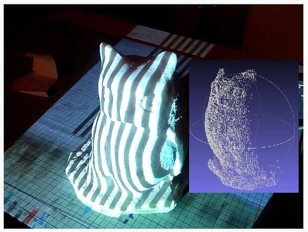 Proyectar una banda estrecha de luz sobre un tridimensional en forma de superficie produce una línea de iluminación que aparezca distorsionada desde otras perspectivas que el del proyector y puede ser utilizada para una exacta reconstrucción geométrica de la forma superficial. Bandas horizontales y verticales de luz proyectadas sobre la superficie del objeto y luego capturadas por dos cámaras Web.