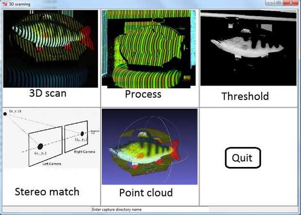 Para usar parte de la exploración 3d que es necesario instalar dos cámaras y un proyector, pero para otras partes simplemente haga clic en el botón. Para probar los datos de ejemplo primero haga clic en proceso entonces umbral estéreo igualar y finalmente punto de nube. Instalar Meshlab para ver la nube de puntos.