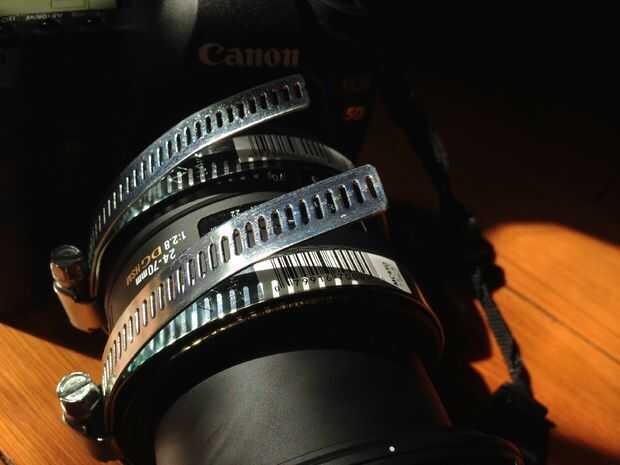 Suavemente Coloque las abrazaderas de pipa alrededor de los puños en su lente, donde sería ajustar el zoom y el enfoque.