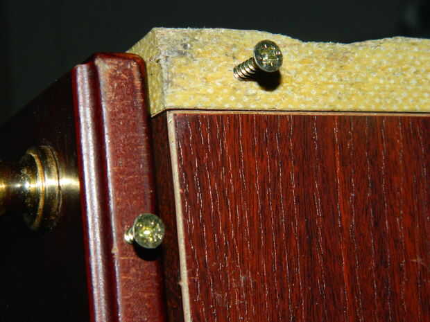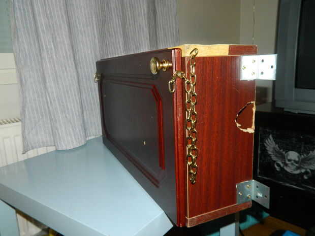 Taladre dos agujeros para el caso real del estante y la tapa de la plataforma como en el cuadro 3-4 y luego instalar la cadena entre la tapa y la caja. una al cada lado para que se vea como en cuadro 5. utilice cortadores de alambre para cortar la cadena. (sugerencia. deje algunos lazos extras a la longitud de las cadenas después de medir para que tengas la posibilidad de ajustar la longitud luego para ya y para una longitud más corta).
