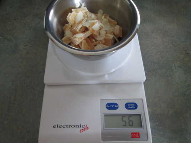 Primero medido hacia fuera de cada ingrediente en la escala digital.  Tenía barra cera de las abejas así que picado primero y mide 56 g.