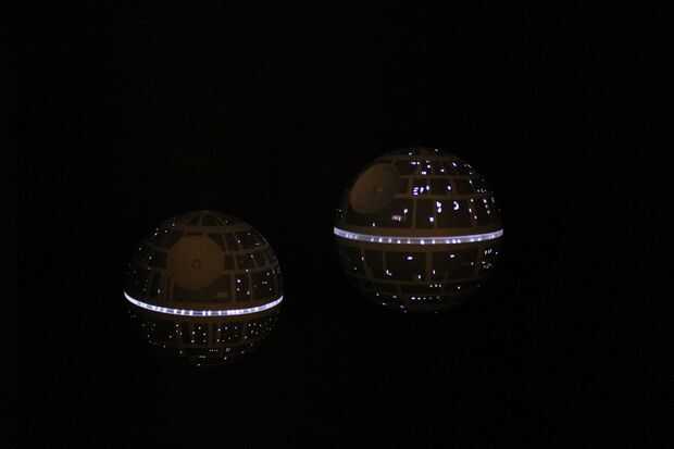 - ornamentos de acrílico claro de 100mm (procedentes de http://factorydirectcraft.com/catalog/products/1302_1039-10569-100mm_clear_acrylic_fillable_ball_ornament.html) son un agradable grado pesado, y vienen en dos mitades que snap junto que también crearía el Ecuador perfecto sobre la estrella de la muerte. Eran $1,99.