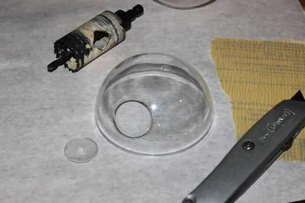 5. bajo el chorro de agua, la arena mitades y disco, dentro y fuera, con el papel de 400 lija. De lijado privides algunos 'dientes' para la masilla de epoxy y la cartilla para que se pegan y en thie dentro el lijado ayudará a difundir la luz LED blanca en cuando lo más tarde.