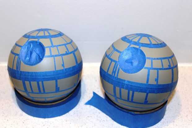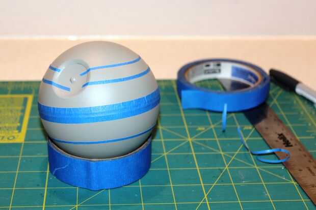 5. ahora comienza la diversión - aplique tiras de cinta adhesiva al globo para todas las partes de luz. Serán diferentes anchos, un par de círculos por la parte superior e inferior y también de cortar algunas piezas curvas cuando se fueron agrupando las piezas rectas hasta demasiado. Busqué fotos de la estrella de la muerte de orientación... hay muchos por ahí.