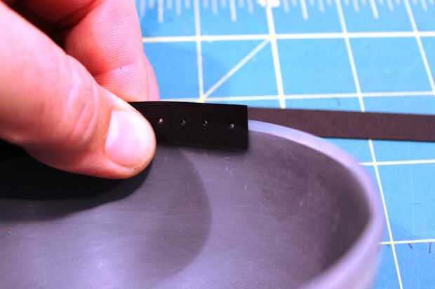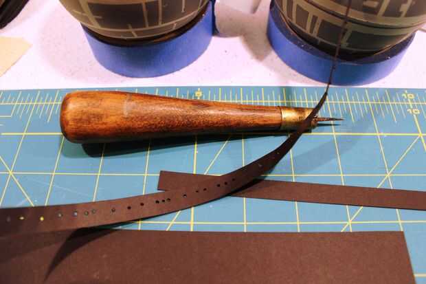 2. hubo demasiada luz proveniente de la fosa principal (Ecuador), así que pegué una tira de tarjeta negra en el interior, con agujeros se asomó a través con un punzón. Sólo asegúrese de alinear los orificios con la franja sin pintar. DAB las manchas de pegamento caliente alrededor del círculo.