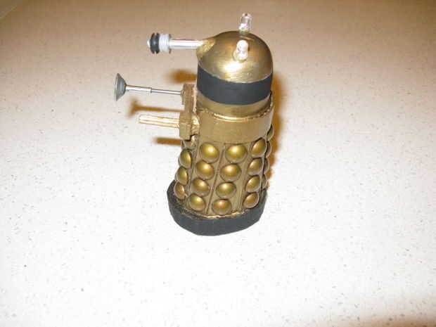 5. la parte superior se puede pintar. Hice una tira negra alrededor de la cabeza y tenía intenciones de pintura en ese patrón de rejilla que Daleks. Dejé que mienten sin embargo.