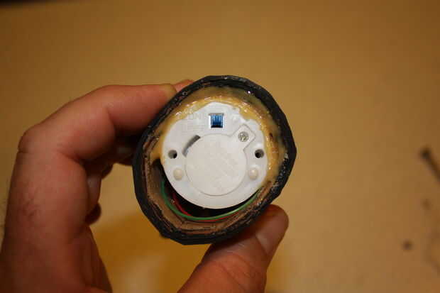 El último paso es pegar la candelita en la base, después de la soldadura de los alambres de la bombilla. En la mía que pierna corta sobre el foco estaba conectada a través del interruptor, el ya estaba conectado a la batería.