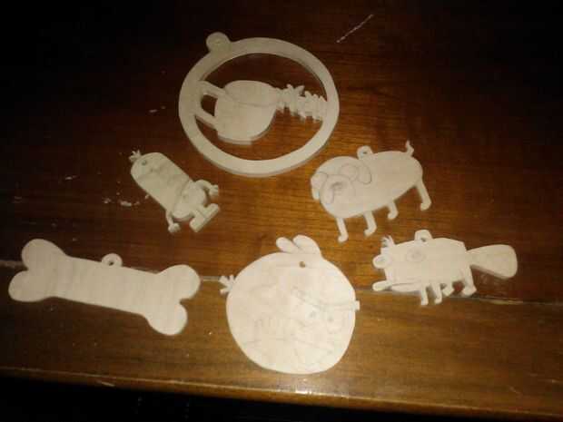 Cortar por el contorno de cada adorno, entonces su taladro colgante. Tuve que lijar mi los cantos un poco después del corte. Nota: pueden apilar para hacer múltiplos de cada uno