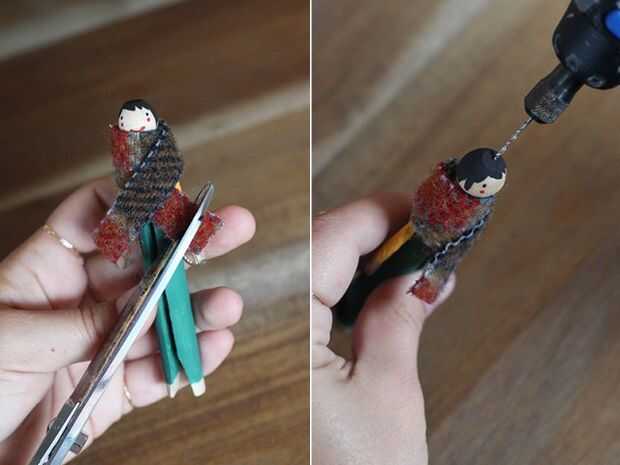 Recorte los extremos. Con un 1/16 el pedacito de taladro, perfore un pequeño agujero en la parte superior de la pinza para la ropa.