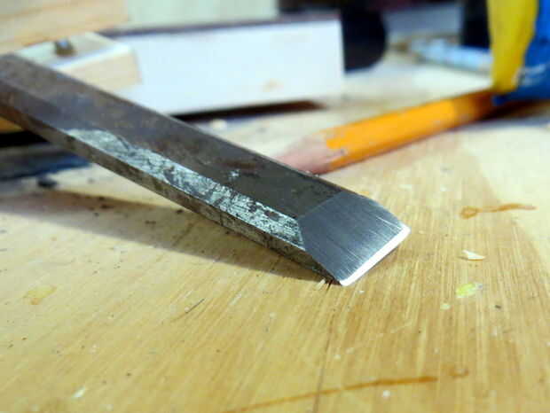 Quite la madera debajo de la placa de vidrio y arena nuevo con papel de lija 600 hasta un microbevel aparece a lo largo de todo el ancho de la hoja. Este no se tome mucho, así que no exagere. Quitar la madera cambia el ángulo de lijado lo suficiente como para crear un microbevel. Tengo algún papel de lija de 1200 con el que me gusta crear biseles finales en ambos lados de la hoja.