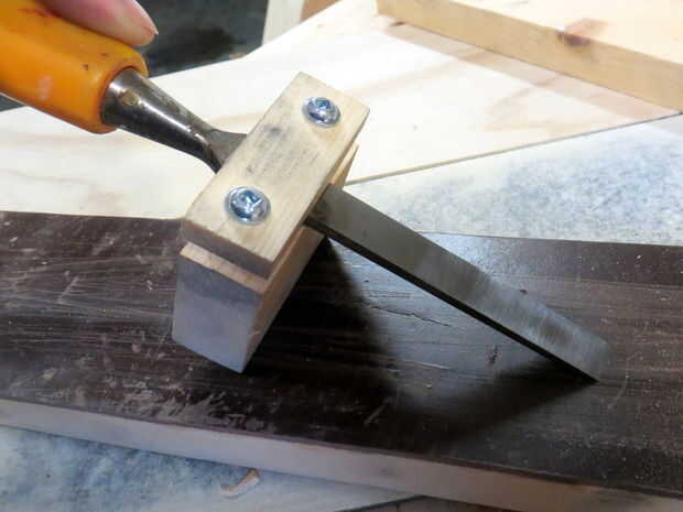 Poner el cristal en una hoja delgada (~ 6 mm) de material. Desea aumentar un poco debido a facilitará crear microbevel que necesita por un borde muy afilado. Ahora configurar tu plantilla sea el bisel plano para el papel de lija de grano 150 cuando la plantilla está descansando en su banco de trabajo. Apriete los tornillos, luego el bisel de la arena hasta que quede plano y liso en todas partes. Yo generalmente cambiar el papel de lija de grano 320, quitar los arañazos, luego cambiar otra vez de grano 600 para que sea brillante.