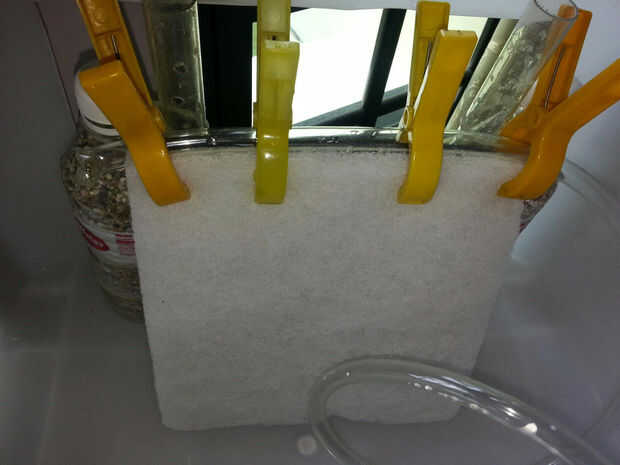 Vamos a tapar el filtro de montaje. Ahora, yo hay dos capas de material filtrante. La parte inferior del filtro no necesita ser asegurada. Los agujeros de la rainbar hacia abajo a la lluvia directamente a los medios de comunicación. Esto moja la media agua. El aire que se extrae del orificio rectangular. El aire pasa a través de los medios del filtro húmedo, limpiar el aire y aún el aire de enfriamiento.