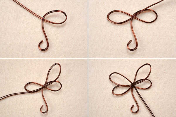 2 º, doble el cable en sentido antihorario para formar un lazo como se muestra en cuadro y coloque el alambre sobre los alambres anteriores; Ahora, tienes un par de alas de la parte inferior;